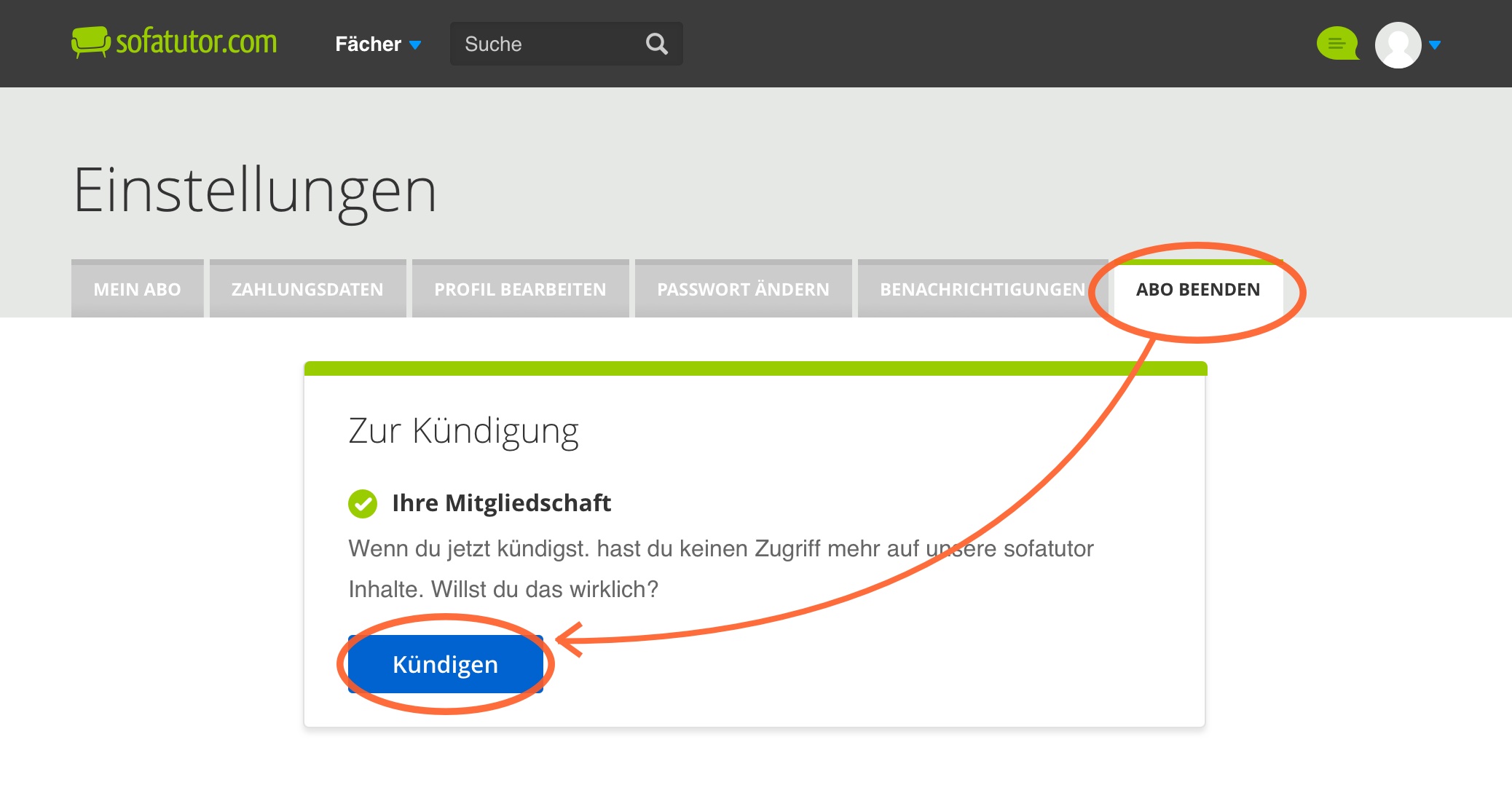 Wenn Sie sofatutor nicht mehr nutzen möchten, so genügt die rechtzeitige Kündigung in Textform (z. B. per Brief, Fax oder E-Mail). Sie können jederzeit zum Ende der von Ihnen gewählten Erstlaufzeit (z. B. 12 oder 24 Monate) kündigen. Wenn nicht gekündigt, verlängert sich Ihre Mitgliedschaft nach Ablauf der Erstlaufzeit zum unrabattierten Monatspreis auf unbestimmte Zeit und kann dann jederzeit mit einer Frist von einem Monat gekündigt werden.
